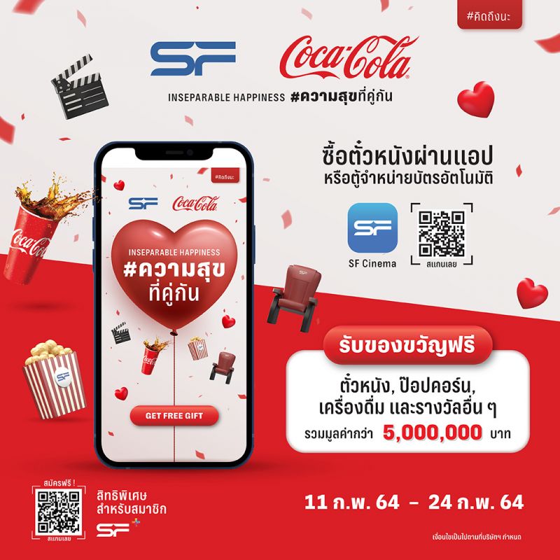 โรงภาพยนตร์ในเครือ เอส เอฟ จับมือ โค้ก ส่งแคมเปญ “ความสุขที่คู่กัน” มอบความรักและความสุขให้ลูกค้า เอส เอฟ รับสิทธิ์ดูหนังแบบสุดคุ้มตลอดเดือนกุมภาพันธ์ 2564 เริ่มต้นด้วยแพ็กเกจบัตรชมภาพยนตร์พร้อมเซทป๊อปคอร์นและเครื่องดื่มในราคาสุดคุ้ม เก็บสิทธิ์ใช้ได้นานถึงสิ้นปี เริ่มต้นที่ 150 บาท ตั้งแต่วันที่ 2-7 กุมภาพันธ์ 2564 เพียงเป็นสมาชิกบัตร SF+ และซื้อผ่านช่องทางออนไลน์ได้ด้วยตนเองที่แอปพลิเคชัน SF Cinema และเว็บไซต์ http://www.sfcinema.com เท่านั้น