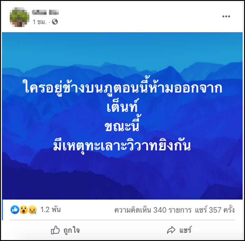 ผู้สื่อข่าวรายงานว่า จากกรณีเมื่อช่วงเวลาประมาณ 20.30 น. ที่ผ่านมา มีผู้ใช้เฟซบุ๊กรายหนึ่งโพสต์ข้อความว่า “ใครอยู่ข้างบนภูตอนนี้ ห้ามออกจากเต็นท์ ขณะนี้ มีเหตุทะเลาะวิวาทยิงกัน” ลงในกลุ่มชมรมคนรักภูกระดึง มีผู้เข้าไปแสดงความคิดเห็นและแชร์ออกไปจำนวนมากอย่างรวดเร็ว โดยส่วนใหญ่ตำหนิว่า ปล่อยให้เหตุการณ์ยิงกันเกิดขึ้นได้อย่างไร พกปืนขึ้นไปได้ด้วยหรือ