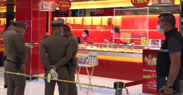 Koh Samui’s Bo Phut police were alerted to the robbery at the Yaowarat Krungthep gold shop at precisely 11.34am on Tuesday and rushed to the scene.