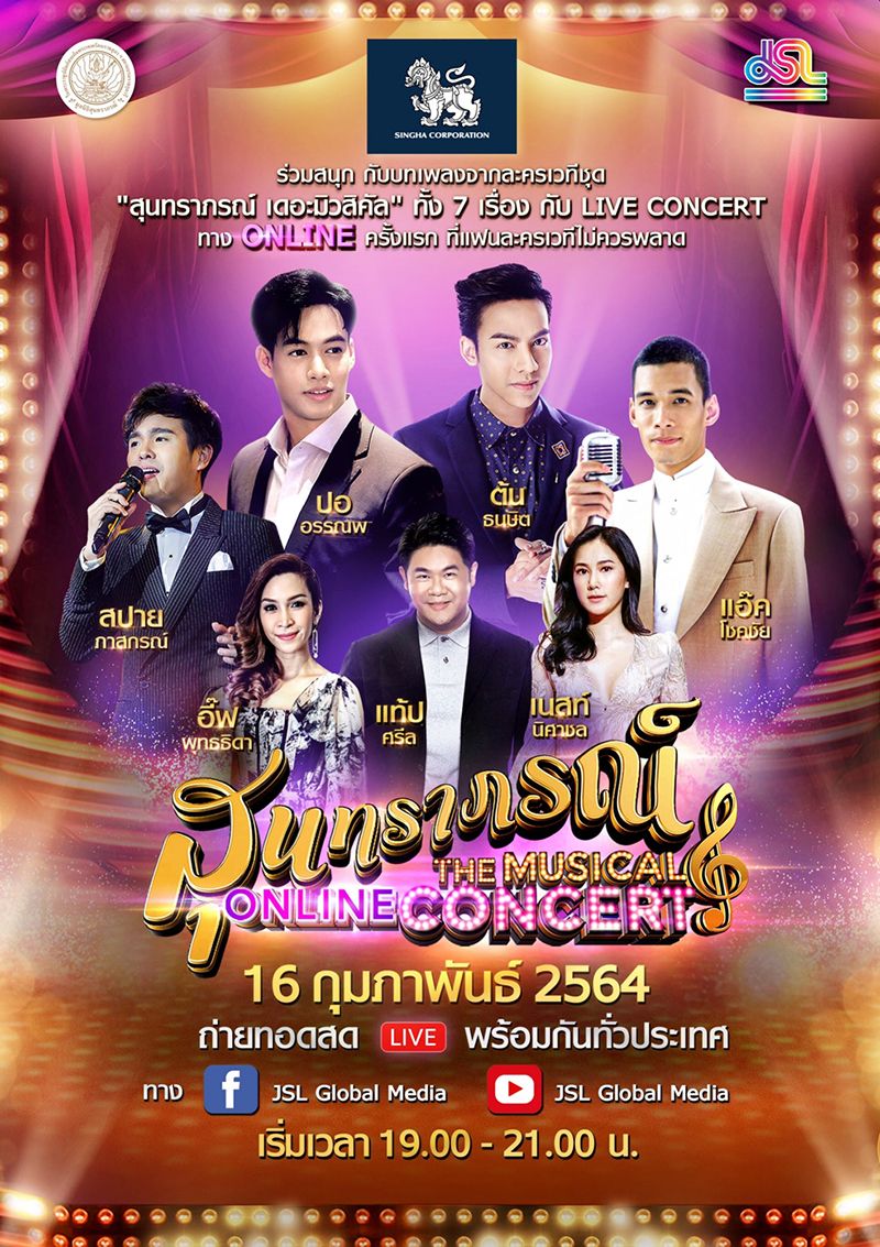 บริษัท เจ เอส แอล โกลบอล มีเดีย จำกัด คว้าผลงานสุดอมตะ “สุนทราภรณ์ เดอะมิวสิคัล” ทั้ง 7 เรื่อง ในรอบ8 ปี กลับมาสร้างปรากฏการณ์ใหม่ ใน “สุนทราภรณ์ เดอะมิวสิคัล ออนไลน์ คอนเสิร์ต” สนับสนุนโดย สิงห์ คอร์เปอเรชั่น ถ่ายทอดผ่าน 7 ศิลปินที่หลงใหลบทเพลง และเคยสร้างความประทับใจมาแล้วจากละครเวทีสุนทราภรณ์ นำโดย “ปอ-อรรณพ ทองบริสุทธิ์,ต้น-ธนษิต จตุรภุช, เนสท์-นิศาชล สิ่วไธสง, สปาย-ภาสกรณ์ รุ่งเรืองเดชาภัทร์,อี๊ฟ-พุทธธิดา ศิระฉายา, ศรีล สุขุม” พร้อมแขกรับเชิญสุดพิเศษ “แอ๊ค-โชคชัย หมู่มาก” แชมป์คนแรกจากเวที “The Golden Song เวทีเพลงเพราะ” โดยมีหนุ่ม “ปาล์ม-ธัญวิชญ์ เจนอักษร” รับหน้าที่พิธีกร งานนี้ถือเป็นครั้งแรกที่นำ 18 บทเพลง จากการแสดงละครเวทีทั้ง 7 เรื่อง มาร้อยเรียงในรูปแบบคอนเสิร์ต ให้แฟนละครเวทีได้ชมแบบเต็มอิ่มและปลอดภัยแบบนิว นอร์มอล ไม่ต้องมารวมตัวกัน ก็สามารถรับชมและฟินแบบจุใจ รื่นอารมณ์ไปพร้อมกันผ่านทาง Live Facebook และ Youtube JSL Global Media