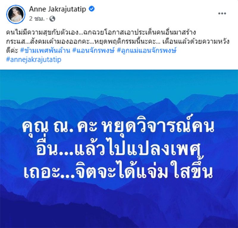ล่าสุด แอน จักรพงษ์ ออกมาเคลื่อนไหวอีกครั้งโดยโพสต์ข้อความในเฟซบุ๊กระบุว่า คุณ ‘ณ’ คะ หยุดวิจารณ์คนอื่นแล้วไปแปลงเพศเถอะ จิตจะได้แจ่มใสขึ้น (‘ณวัฒน์’เหน็บแรงถึงใคร? ศัลยกรรมเปลี่ยนได้ทุกอย่าง ยกเว้นนิสัยและความคิด)