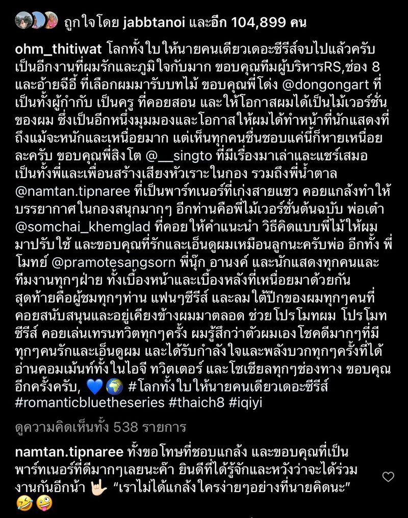 สร้างความประทับใจในตอนจบ จนทะยานขึ้นสู่เทรนด์ทวิตเตอร์อันดับ 1 สำหรับภาพยนตร์ซีรี่ส์ในตำนานอย่าง“โลกทั้งใบให้นายคนเดียว เดอะซีรี่ส์” ทางสถานีโทรทัศน์ช่อง 8 เรียกได้ว่าทุบสถิติ ปิดฉากได้สวยงาม โดยล่าสุดพระเอกหนุ่ม “โอห์ม-ฐิติวัฒน์ ฤทธิ์ประเสริฐ” ถึงขั้นขึ้นอินสตาแกรมส่วนตัว โพสต์ซึ้งขอบคุณนักแสดงรุ่นใหญ่อย่าง “เต๋า-สมชาย” และ “โมทย์-ปราโมทย์” ที่ร่วมเคียงข้าง พร้อมทั้งอีกสองนักแสดงหลักอย่าง สิงโต-ปราชญา, น้ำตาล-ทิพนารี ที่เป็นทั้งเพื่อนและพี่ที่คอยให้คำปรึกษา และขอบคุณแฟนคลับทุกคนที่คอยช่วยซัพพอร์ตตลอดมา เพราะเป็นการสร้างประสบการณ์ใหม่ในชีวิตนักแสดงของตัวเองแถมเป็นอีกหนึ่งความทรงจำชั้นดีในชีวิต