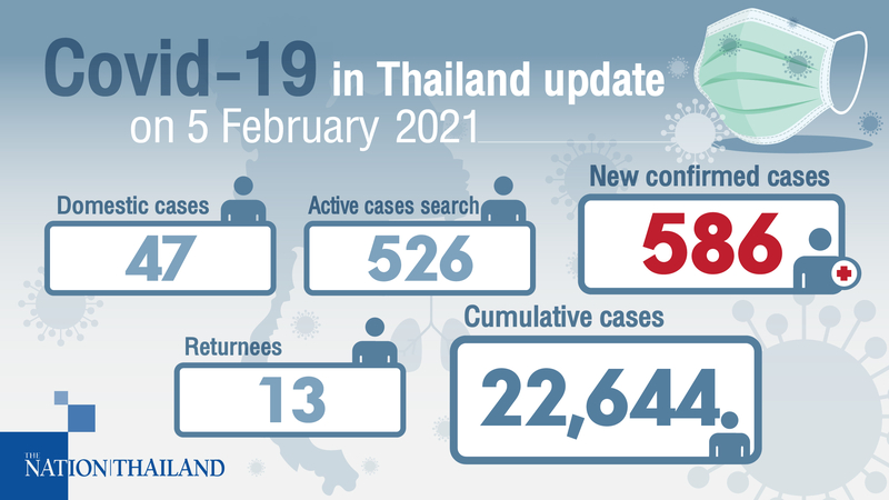 The Centre for Covid-19 Situation Administration (CCSA) on Friday reported 586 new cases, 13 of whom are Thai returnees in quarantine facilities.