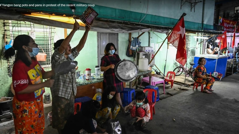 At 8 p.m. Tuesday, the banging of pots filled the air in Myanmar’s largest city. Residents of Yangon, the country’s former capital, unleashed a volley of pan rattling, drum beating and horn honking, a dissonant moment of dissent a day after the military seized power in a coup.