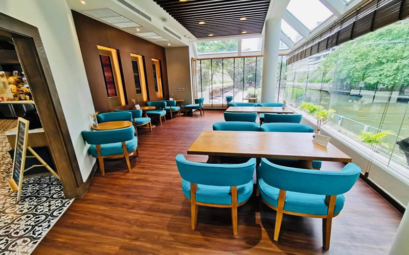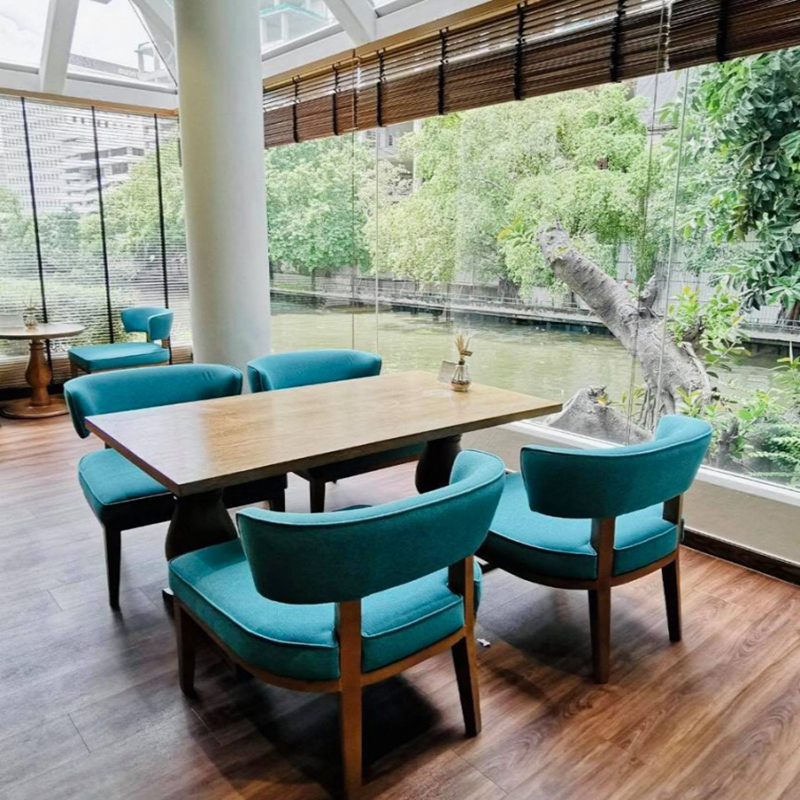 สำหรับ “ริมคลองคาเฟ่” ตัวร้านเป็นเรือนกระจกใส ตกแต่งในสไตล์โมเดิร์นผสมผสานสไตล์วินเทจดูกลมกลืนกัน ตัวร้านโปร่งนั่งสบาย ยิ่งนั่งริมกระจกก็จะเห็นเรือหางยาวโดยสารแล่นไปมาในคลองแสนแสบอยู่เป็นระยะๆ เรียกว่าบรรยากาศดีมากๆเลยทีเดียว ซึ่งริมคลองคาเฟ่เป็นคาเฟ่สำหรับคนรักสุขภาพโดยเฉพาะที่ตั้งอยู่ใจกลางกรุง โดยอยู่ชั้นล่างของ Movenpick BDMS Wellness Resort Bangkok