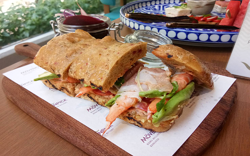 (แซนวิชบีทรูทฟอคคาเซีย สอดไส้กุ้ง พาร์มาแฮม อะโวคาโดสดและมะเขือเทศ)