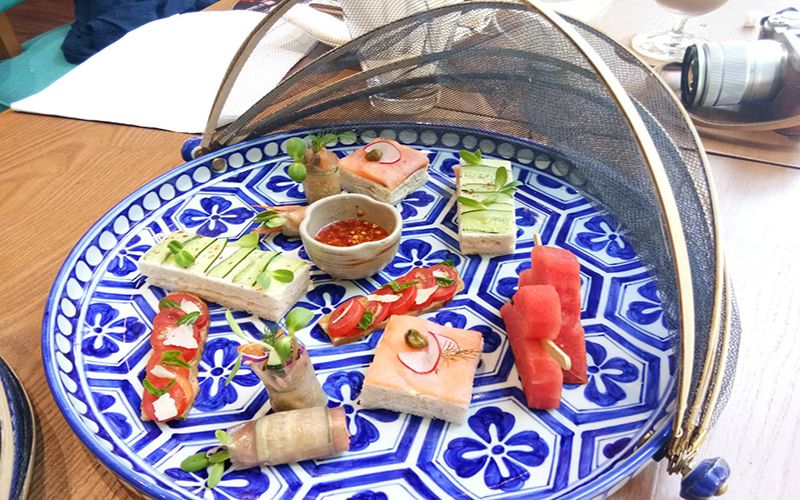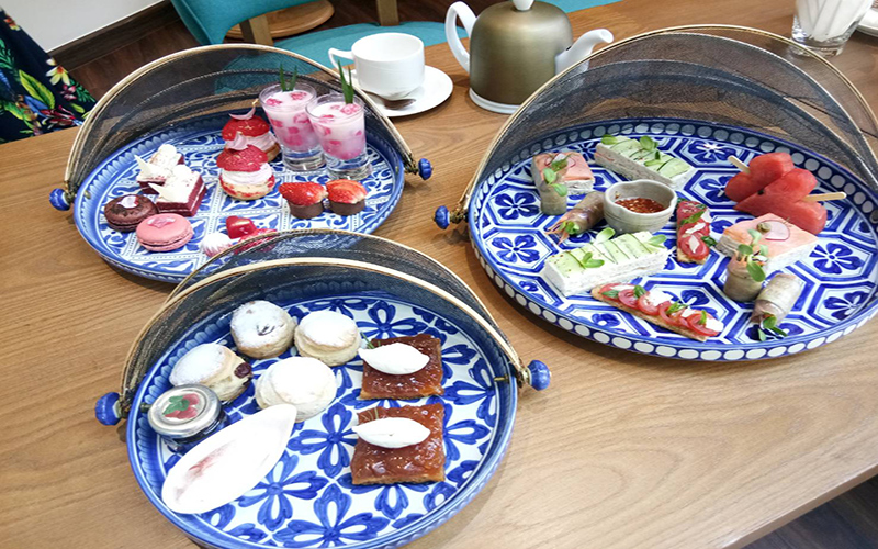 ราคาชุด Afternoon Tea 1,200++ บาท สำหรับ 2 ท่าน ในชุดก็จะมีของคาวและของหวาน จำนวน 3 จาน มีทั้งอาหารแบบไทยและฝรั่ง และเครื่องดื่มร้อนเย็นตามแต่จะเลือก