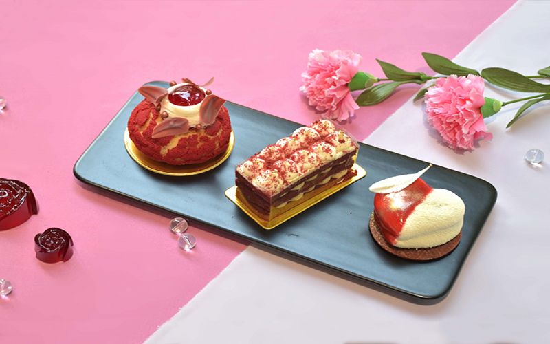 ขนมอบและเค้กในธีมวาเลนไทน์ เริ่มต้นที่ 140 ++ บาท / ชิ้น เมนูดังนี้ ราสเบอร์รี่ชูซ์ มินิเค้กพีชและลิ้นจี่รูปหัวใจ เค้กเรดเวลเวตและอื่น ๆ