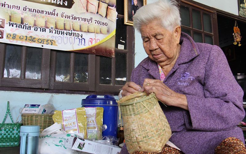 ไม้ไผ่ลำขนาดเล็ก ขนาดใหญ่ ที่มีอยู่ในชุมชน ต.ท่าเคย อ.สวนผึ้ง จ.ราชบุรี ถูกนำมาสร้างสรรค์ด้วยฝีมือของผู้วัยที่ใช้เวลาอยู่กับบ้านให้เกิดประโยชน์ แต่ละชิ้นใช้ระยะเวลาที่ยาวนานข้ามวันข้ามคืนกว่าจะได้ผลิตภัณฑ์ที่แตกต่างตามความถนัดของแต่ละคน อย่างคุณป้าบางคนนัดด้านจักสานเข่ง เปล ตะกร้า คุณยายอีกคนถนัดด้านการสานกระบุงขนาดเล็ก และพัฒนาให้กลายออกมาเป็นเป้สะพายหลัง และผลิตภัณฑ์ต่างๆ ตามความถนัดแม้จะมีอายุมากแล้ว แต่ด้วยฝีมือและใจรักทำให้ทุกคนรวมกลุ่มสร้างสรรค์ชิ้นงานจักสานไม้ไผ่ขึ้นมา หวังใช้เวลาที่เหลือให้กับงานที่ตนเองรักและผูกพัน