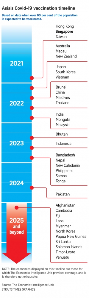 The Economist Intelligence Unit (EIU) said on Jan 27 that Singapore, Hong Kong and Taiwan will reach so-called herd immunity by the end of the year, with Australia and New Zealand soon to follow.