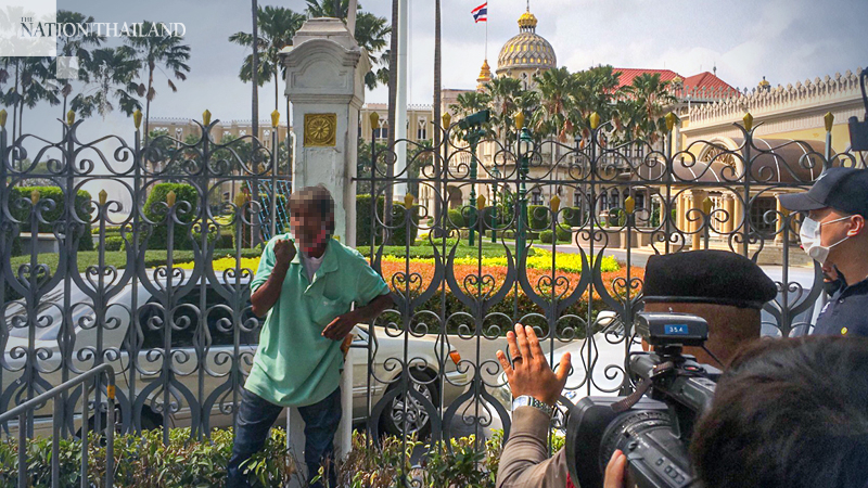 The man, named as Praset Adam, 62, told police he had been cheated out of a large sum of money by a friend. Standing by a Government House entrance surrounded by police, guards and reporters, he held the knife to his throat and threatened take his own life unless the government helped pay off his debt of Bt800,000.