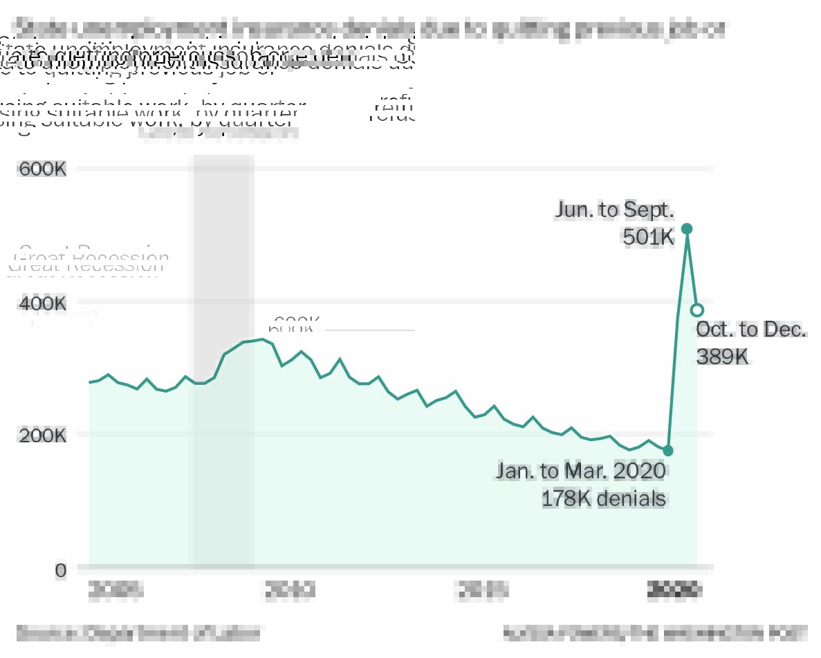 Burlingame is one ofmore than 1.5 million people who quit their jobs voluntarily because of the pandemic last year and filed for unemployment insurance, according to data from the Department of Labor, more than twice the amount over the same period in 2019. Some 80 percent have had their claims denied. A separate group of 75,000 have applied for unemployment insurance after being laid off anddeclining to return to work; 49 percent of that group had their claims denied.