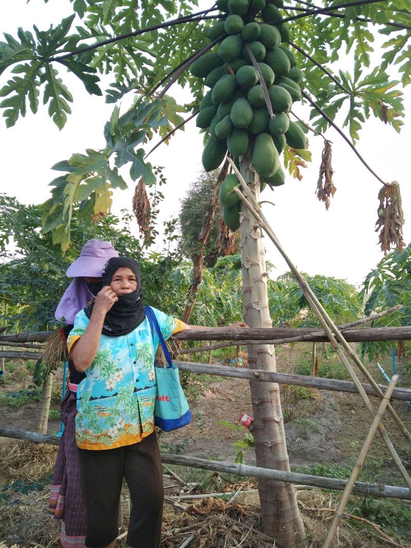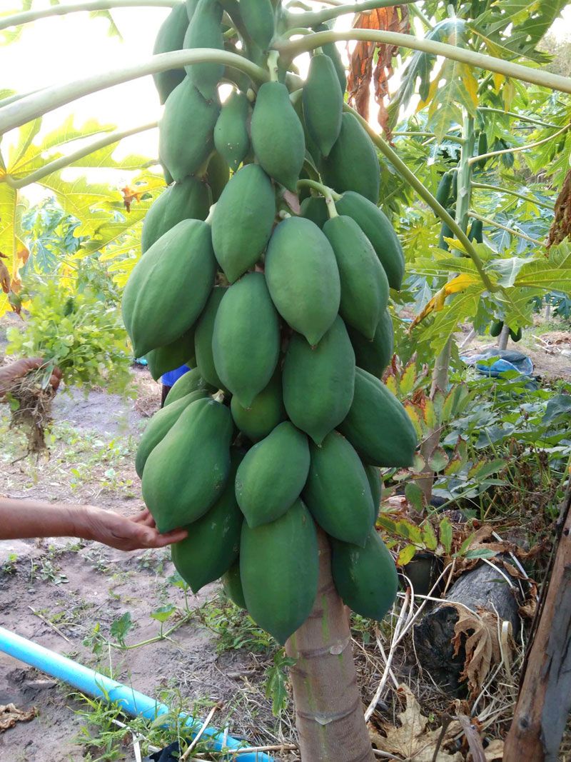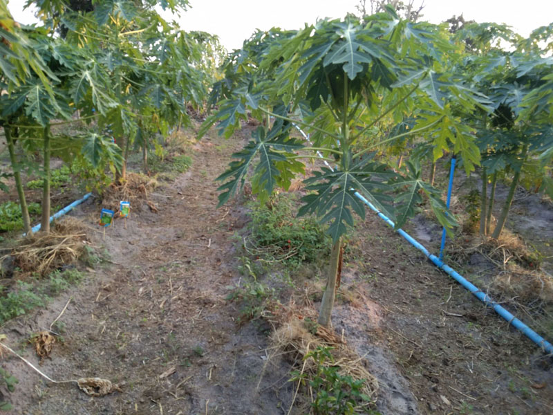 ผมปลูกมะละกอพืชหลักเป็นแถวคู่ 2X2 เมตร ร่องระหว่างต้น ปลูกพืชผักสวนครัว คะน้า ผักกระจ้อน ผักชี สลัด มะเขือเทศ ผักกาด รอบแปลงปลูกตะไคร้ พริก มะเขือ ฝรั่งไร้เมล็ด ร่องฝรั่งปลูกข่า