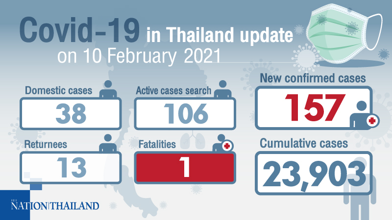 As of Wednesday, the number of confirmed cases in Thailand has risen to 23,903. Of these, 21,329 had been contracted locally, including 13,545 who were found via proactive testing, while 2,574 were returnees. So far, 18,914 have recovered and been discharged, 4,909 patients are undergoing treatment (2,593 in hospital and 2,316 in field hospitals) and the death toll has increased to 80.