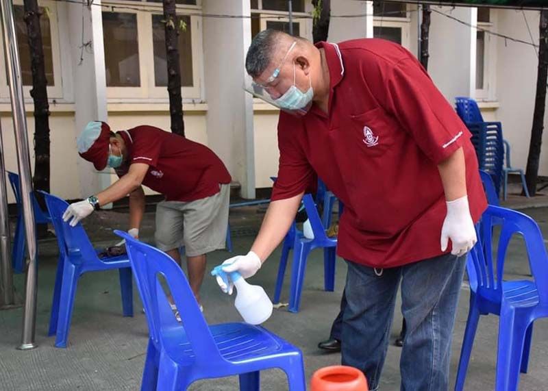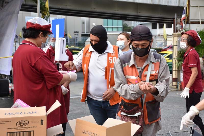 ภาพบรรยากาศในกิจกรรมมอบอาหารโครงการน้ำพระทัยพระราชทาน พร้อมมาตรการป้องกันการแพร่ระบาดของโรคติดเชื้อไวรัสโคโรนา 2019 (COVID-19) ด้วยการให้ใส่หน้ากากอนามัย ตรวจวัดอุณหภูมิ เจลล้างมือ และเว้นระยะห่างทางสังคม และล้างพื้นด้วยน้ำยาฆ่าเชื้อทุกครั้งหลังเสร็จสิ้นกิจกรรม