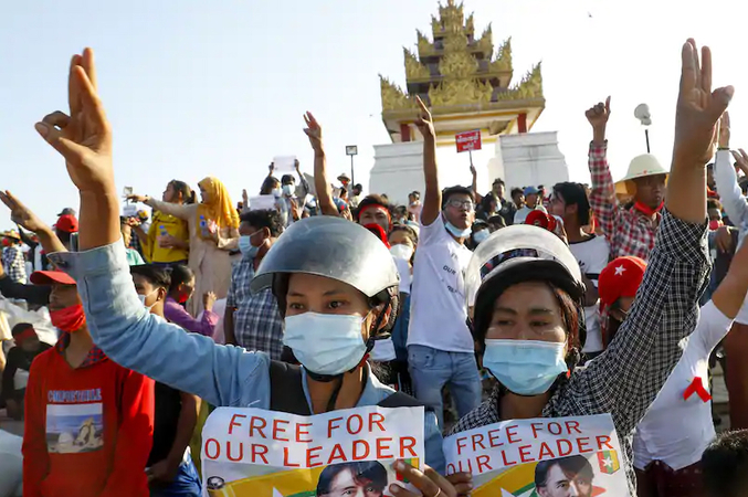 On Sunday, demonstrators in Yangon massed near the iconic Sule Pagoda, the site of major pro-democracy uprisings in previous decades, defied the military by holding up three fingers in a gesture of resistance popularized by the “Hunger Games” series.