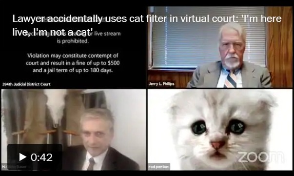 At a routine civil forfeiture case hearing in Texas’ 394th Judicial District Court, Rod Ponton, Presidio County attorney, accidentally signed on with the cat filter, making the flummoxed attorney look like an adorable kitten. The 34-second clip of Ponton’s brief appearance as a cat immediately amusing many and becoming a viral hit among the likes of Vermont Sen. Bernie Sander’s mittens and runaway llamas at a time when court events are frequently held virtually.