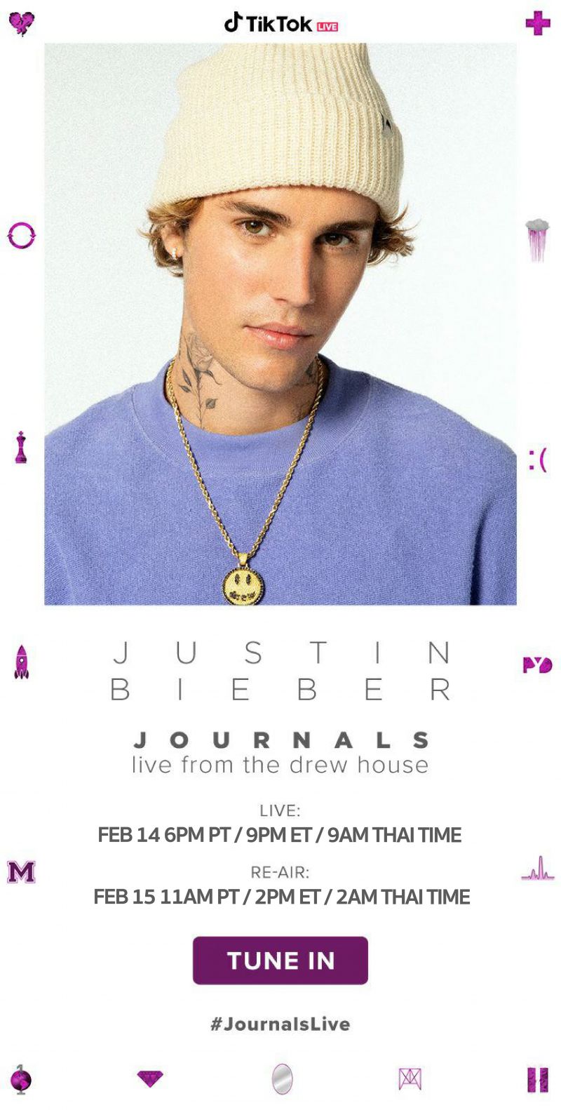 โดย TikTok LIVE กับ จัสติน บีเบอร์ ในครั้งนี้เรียกได้ว่าเป็นการ Live แสดงคอนเสิร์ตเต็มรูปแบบสุดเอ็กซ์คลูซีฟของจัสติน บีเบอร์ ที่เกิดขึ้นบน TikTok ซึ่งจะเป็นการนำเพลงรักที่เต็มไปด้วยความโรแมนติกที่ได้รับความนิยมในปี 2013 จากอัลบั้ม Journals มาถ่ายทอดท่ามกลางบรรยากาศสุดพิเศษรับเทศกาลวาเลนไทน์แบบให้แฟนคลับทั่วโลกได้เกาะขอบเวทีติดตามทุกเพลงที่ชื่นชอบซึ่งจะจัดขึ้นในวันที่ 14 กุมภาพันธ์ เวลา 09.00 น.โดยสามารถรับชมได้ทาง แอคเคาน์@justinbieber และจัดแสดง Live อีกครั้งในวันที่ 15 กุมภาพันธ์ เวลา02.00 น.