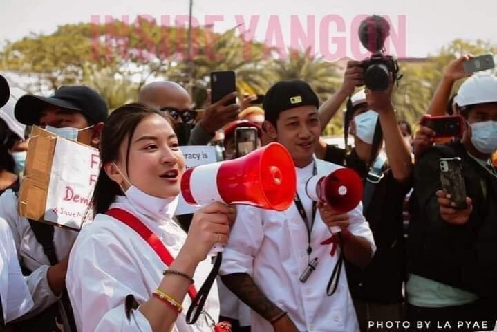 ก่อนหน้านั้น วันที่ 10 ก.พ.2564 ดาราสาวแสนสวย Wut Hmun Shwe Yee ได้ไปแสดงพลังที่หน้าสถานทูตสหรัฐฯ ในย่างกุ้ง ร้องขอให้สหรัฐกดดันเผด็จการทหารให้คืนประชาธิปไตยให้แก่ประชาชนเมียนมา