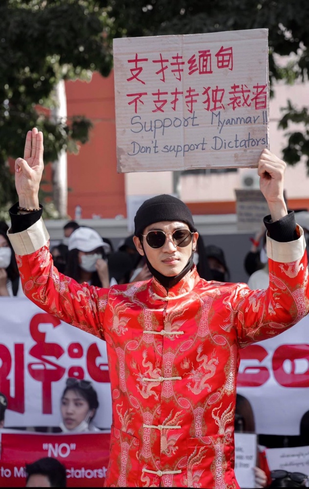 วันที่ 11 ก.พ.2564 ที่หน้าสถานทูตจีนประจำย่างกุ้ง Paing Takhon นายแบบสุดหล่อ พาเพื่อนนักร้องมาประท้วงรัฐบาลจีน และขอให้ประธานาธิบดีสีจิ้นผิง ยุติการช่วยเหลือรัฐบาลทหารเมียนมา