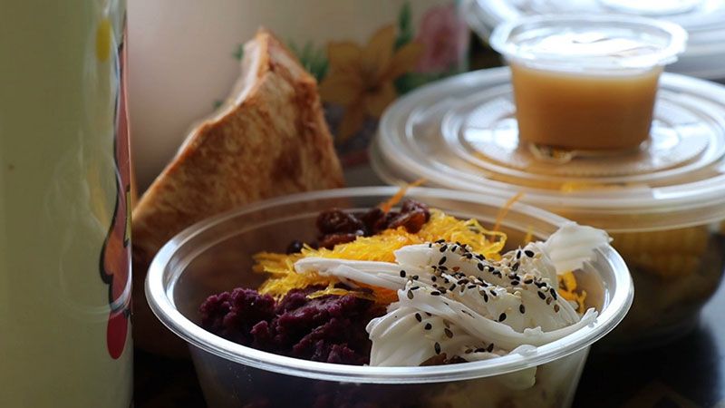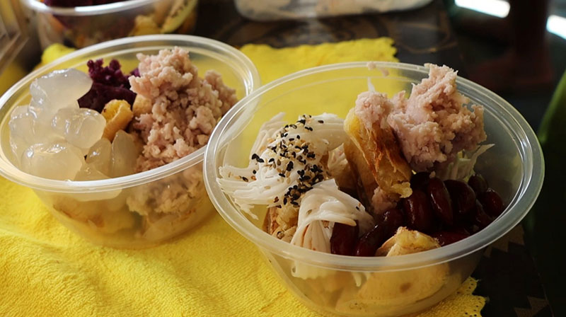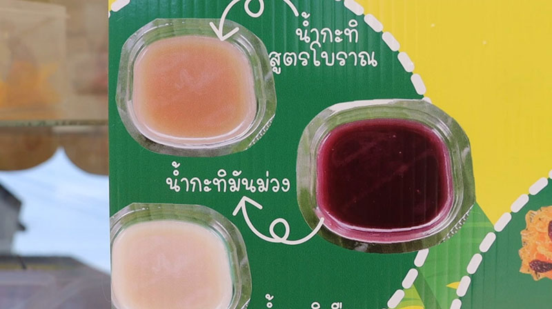 โดยทางราดจะมีให้เลือกทั้งน้ำราดกะทิสูตรโบราณ (เป็นซิกเนเจอร์ของทางร้าน) น้ำราดมันม่วง และน้ำราดเผือก ส่วนเมนูที่ 2 คือกล้วยปิ้งไส้ทะลัก จะใช้กล้วย 4 ลูก/1 ชุด ผ่ากลาง แล้วยัดไส้เข้าไปทั้ง 4 ลูก แบบแน่นๆ ล้นๆ จนทะลัก และให้เลือกน้ำราดได้ 1 ชนิด เช่นเดียวกัน ส่วนราคาขายก็ไม่แพง กล้วยปิง ชุดธรรมดา ราคา 30 บาท กล้วยปิงทรงเครื่อง ชุดละ 40 บาท และกล้วยปิ้งไส้ทะลักชุดละ 40 บาทเท่านั้น
