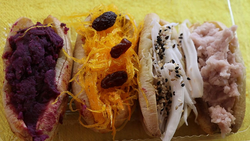 นายภัททพงษ์ฯ เล่าต่อว่ากล้วยปิ้งของตนจะไม่เหมือนกับกล้วยปิ้งทั่วไป เพราะจะคิดเลือกแต่กล้วยดิบ ห่ามๆ แต่ไม่สุก มาปอกแช่น้ำเกลือสักพัก จากนั้นนำขึ้นปิ้งด้วยไฟอ่อน จะใช้เวลานานหน่อย แต่สีกล้วยจะสวย ไม่ไหม้ จากนั้นก็นำมาทุบ แต่อุปกรณ์ที่ทุบต้องเป็นสากกะเบือเท่านั้น เพราะความแรงจะพอดีกับลูกกล้วย จากนั้นก็นำมาประยุกต์ใส่เครื่อง จะแบ่งเป็น 2 เมนู คือ เมนูกล้วยปิ้งทรงเครื่อง ก็จะนำกล้วยมาตัดเป็นชิ้นพอดีคำใส่ถ้วย และให้ลูกค้าเลือกหน้าได้ 3 หน้า คือมีทั้ง หน้าฝอยทอง ลูกเกด มะพร้าวน้ำหอม มันม่วง เผือกข้าวโพด ถั่วแดง และลูกชิด และสามารถเลือกน้ำราดได้หนึ่งอย่าง