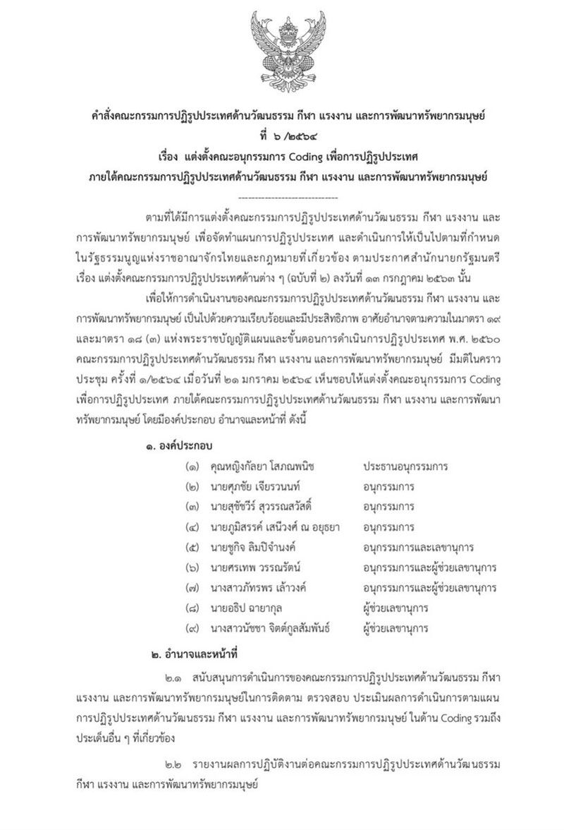เพื่อให้การดำเนิงานของคณะกรรมการปฏิรูปประเทศค้นวัฒนธรรม กีฬา แรงงาน และการพัฒนาทรัพยากรมนุษย์ เป็นไปด้วความเรียบร้อยและมีประสิทธิภาพ อาศัยอำนาจตามความในมาตรา 19 และมาตรา 18 (3) แห่งพระราชบัญญัติแผนและขั้นตอนการดำเนินการปฏิรูปประเทศ พ.ศ. 2560 คณะกรรมการปฏิรูปประเทศด้านวัฒนธรรม กีฬา แรงาน และการพัฒนาทรัพยากรมนุษย์ มีมติในคราวประชุม ครั้งที่ 1/2564 เมื่อวันที่ 21 มกราคม 2564 เห็นชอบให้แต่งตั้งคณะอนุกรรมการ Coding เพื่อการปฏิรูปประเทศ ภายใต้คณะกรมการปฏิรูปประเทศด้านวัฒนธรรม กีฬา แรงงาน และการพัฒนาทรัพยากรมนุษย์ โดยมีองค์ประกอบ อำนาจและหน้าที่ ดังนี้