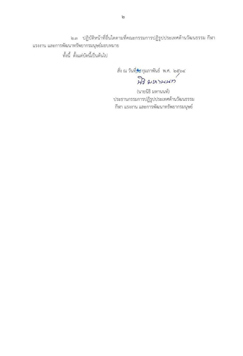 2.3 ปฏิบัติหน้าที่อื่นใดตามที่คณะกรรมการปฏิรูปประเทศด้านวัฒนธรรม กีฬาแรงาน และการพัฒนาทรัพยากรมนุษย์มอบหมาย