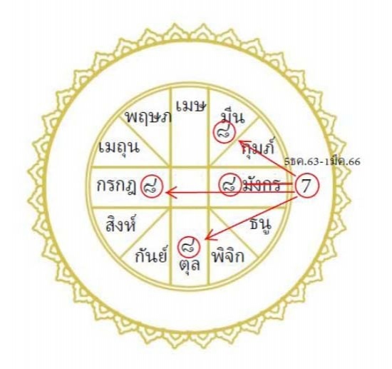 2. ไม่เพียงแต่ชะตาเมืองเท่านั้น แต่คนทุกลัคนาราศีหากผูกดวงชะตาแล้วมีพระราหูดวงเดิมที่แทนด้วยเลข๘ (เน้นว่าเลขไทย) อยู่ในราศีมังกร หรือราศีมีน หรือราศีกรกฎ หรือราศีตุลย์ตั้งแต่เกิด ถือว่ารองรับโชคจากพระเสาร์จร 7 (เน้นว่าเลขอารบิก) ซึ่งเป็นคู่มิตรกันในรอบนี้ไปถึง 1 มีนาคม 2566 เลยทีเดียว อาการคือหาแล้วได้มากกว่าที่คิด-หา