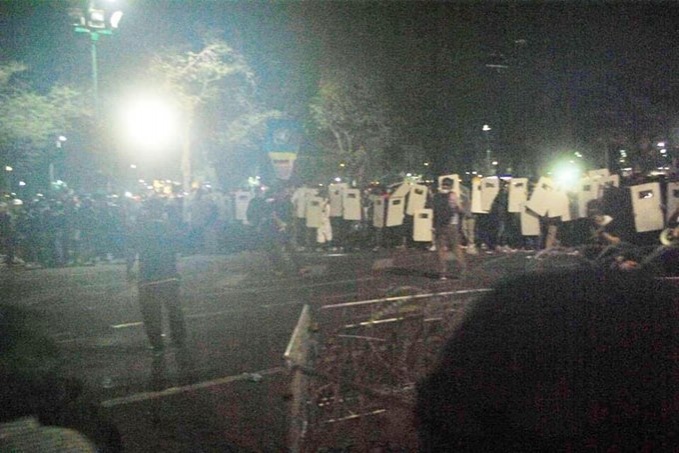 “ขณะมีการเจรจา จนตำรวจยอมรับข้อตกลง และยอมอ่อนท่าที แต่มีกลุ่มวัยรุ่นหัวรุนแรงทางด้านขวามือของ คฟ.(ชุดควบคุมฝูงชน) พยายามยั่วยุ และปะทะ จะพยายามบุกทำร้ายเจ้าหน้าที่ คฟ. ซึ่งตั้งกองกำลังอย่างนิ่งเฉย จนทีมการ์ดม็อบไประงับเหตุ ก็เกิดการกระทบกระทั่งด่าทอ และจะเข้ามาทำร้ายทีมการ์ดม็อบ หลังจากนั้น ครูใหญ่จึงเดินมาหน้ารั้ว หลังลวดหนามเพื่อพยายาม บอกกลุ่มวัยรุ่นหน้าลวดหนามให้ใจเย็นๆ แต่ไม่เป็นผล หลังจากนั้นมีการขว้างปาขวดน้ำและสิ่งต่างๆตามมาทันที..”