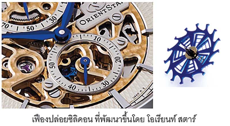 เฟืองปล่อยซิลิคอนใหม่พร้อมกลไกสปริงได้รับการพัฒนาขึ้นโดยโอเรียนท์ สตาร์ ด้วยการใช้เทคโนโลยี MEMS ซึ่งใช้ในกระบวนการผลิตของหัวพิมพ์ที่มีความแม่นยำสูงของเอปสัน (Epson) เดือยที่มองเห็นได้ผ่านโครงสร้างของนาฬิกาแบบเปลือยใช้เทคโนโลยีเซมิคอนดักเตอร์ของเอปสันในการควบคุมความหนาของฟิล์มที่ระดับนาโนเมตรเพื่อปรับการสะท้อนแสงทำให้เป็นสีน้ำเงินที่สะดุดตาสดใสและรูปทรงเกลียวอันเป็นเอกลักษณ์ทำให้เกิดเป็นกาแล็กซี่ทางช้างเผือกซึ่งเป็นสัญลักษณ์ของธีมการออกแบบที่ได้รับแรงบันดาลใจจากจักรวาลในโอกาสครบรอบ 70 ปีของโอเรียนท์ สตาร์