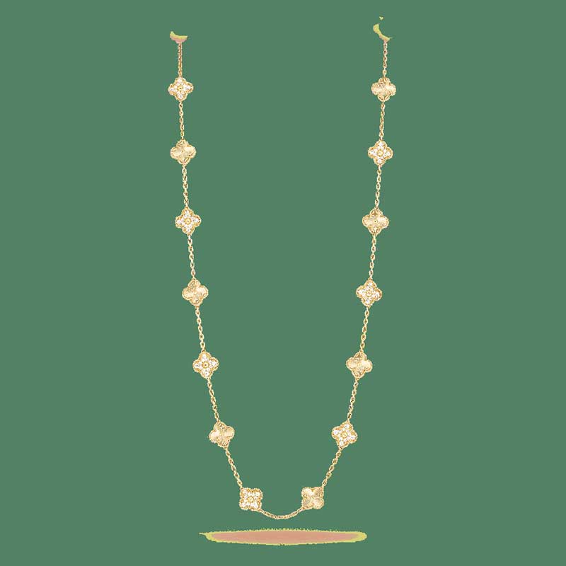 เริ่มต้นด้วยคอลเลคชั่น Alhambra (อัลลองบรา) ผลงานอันทรงแบบฉบับประจำเมซง ซึ่งถือกำเนิดครั้งแรกในปี ค.ศ. 1968 ในรูปของสร้อยคอยาว ขึ้นตัวเรือนโดยใช้ทองสีเหลือง พร้อมแผ่นโมทีฟสัญลักษณ์ใบโคลเวอร์สี่แฉกเดินขอบรายรอบด้วยจุดไข่ปลาเรียงร้อยกันอย่างสละสลวย กลายเป็นจุดเริ่มต้นตำนานเครื่องประดับนำโชคผลงานประจำเมซงอย่างไร้ที่ตินับแต่นั้นเป็นต้นมา กว่า 5 ทศวรรษ ที่เมซงยังคงนำเสนอดีไซน์เหนือกาลเวลาผ่านความเป็นเลิศของทักษะความชำนาญการเหนือชั้น โดยเมซงยังคงเติมเต็มคอลเลคชั่นด้วยการสรรหาวัสดุใหม่ๆ มาสร้างสรรค์ผลงาน ที่แสดงให้เห็นถึงความลื่นไหลและความสง่างามของการออกแบบเพื่อให้เป็นปีแห่งความเจริญรุ่งเรืองเมซงนำเสนอเทคนิคสลักลายเส้นแนวคลื่นรัศมีของดวงตะวันที่เรียกว่า “กิโยเช่” (guilloché) มาใช้ทวีประกายเรืองรองให้แก่แผ่นโมทีฟทองคำสีเหลืองสลับด้วยเพชรน้ำงามประกายระยิบระยับ หรือจะเป็นคาร์เนเลียน(Carnelian) สีแดงอมส้ม สีโทนอุ่นที่หมายถึงความรื่นเริงและความสุข โดยคาร์เนเลียน คือหินมีค่าชนิดแรกที่นำมาทำเป็นเครื่องประดับตั้งแต่สมัยครีตก่อนกรีกไม่ว่าจะเป็นสร้อยคอเส้นยาว สร้อยข้อมือ Vintage Alhambra แหวน และนาฬิกา