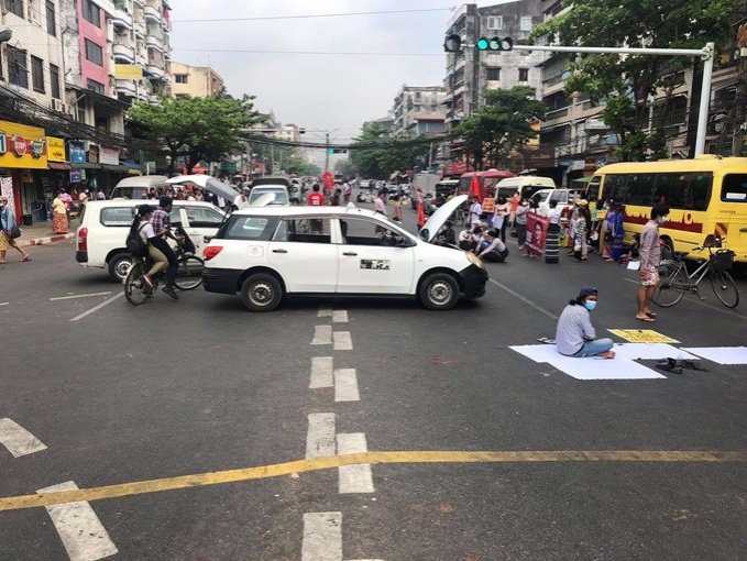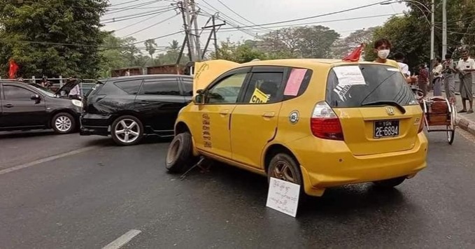 สืบเนื่องจากเมื่อวันจันทร์ที่ผ่านมา กองทัพเมียนมา ได้ส่งรถหุ้มเกราะ และกำลังทหารเข้ามาประจำการในพื้นที่รอบในกรุงย่างกุ้ง และตัวเมืองใหญ่ ผู้ชุมนุมต้านกองทัพเมียนมา จึงงัดกลยุทธ์จอดรถเสียกลางถนน เพื่อปิดกั้นเส้นทางไม่ให้รถหุ้มเกราะ หรือรถของเจ้าหน้าที่ผ่านเข้าไปยังพื้นที่ชุมนุมได้