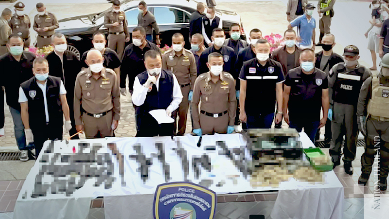 The suspect was brought to Bang Phli Police Station and was initially charged with selling and possessing unregistered firearms as well as possessing a category 1 drug.