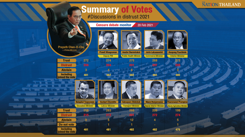 Prime Minister Prayut Chan-o-cha: 272 for, 206 against, 3 abstain