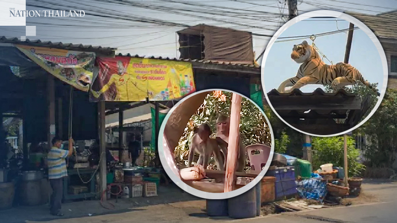 Sanae Phoothong, a 70-year-old former Ban Laem Chabang community president, said on Friday he set up a cage covered by black canvas with a tiger doll inside on the food store’s roof.