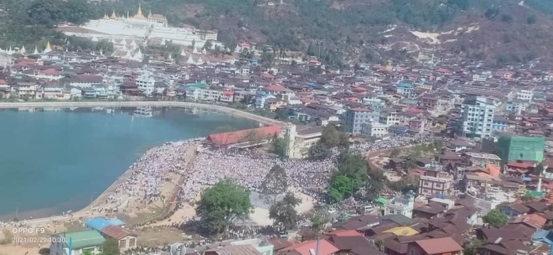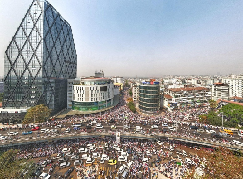 ผู้ใช้บัญชีเฟซบุ๊ค PJW และแฟนเพจเฟซบุ๊ค Travel by Naw Htike ได้ใช้โดรนบินถ่ายภาพมุมกว้างที่เห็นการชุมนุมของมวลชนนับแสน บริเวณแยกเลดัน ย่างกุ้ง เปรียบเช่นเดียวกันกับสี่แยกราชประสงค์ กรุงเทพฯ