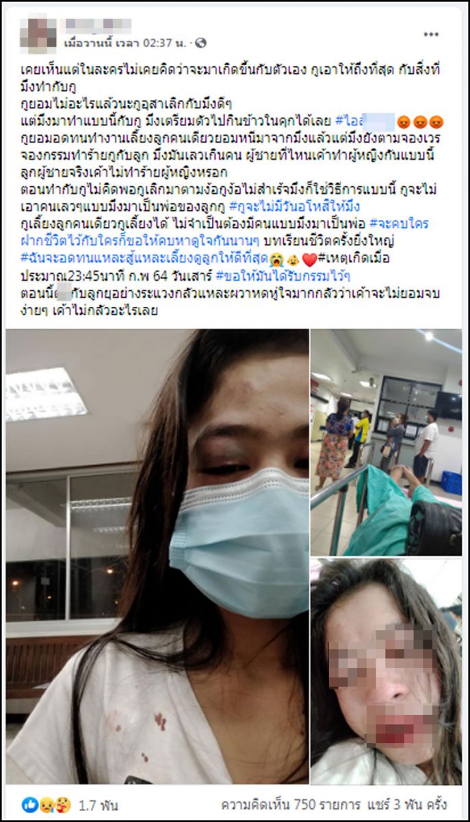 ภาพหญิงสาวสภาพใบหน้าฟกช้ำ ขอบตาบวมเขียว ถูกโพสต์โดยสาวรายหนึ่ง เล่าเรื่องสุดช้ำใจเพราะโดนอดีตแฟนหนุ่มทำร้าย เนื่องจากตามง้อเธอกับลูกไม่สำเร็จ โดยเจ้าตัว ยังเตือนไปถึงผู้หญิงด้วยกันว่า “…จะคบใคร ฝากชีวิตไว้กับใคร ก็ขอให้คบหาดูใจกันนานๆ บทเรียนชีวิตครั้งยิ่งใหญ่…”