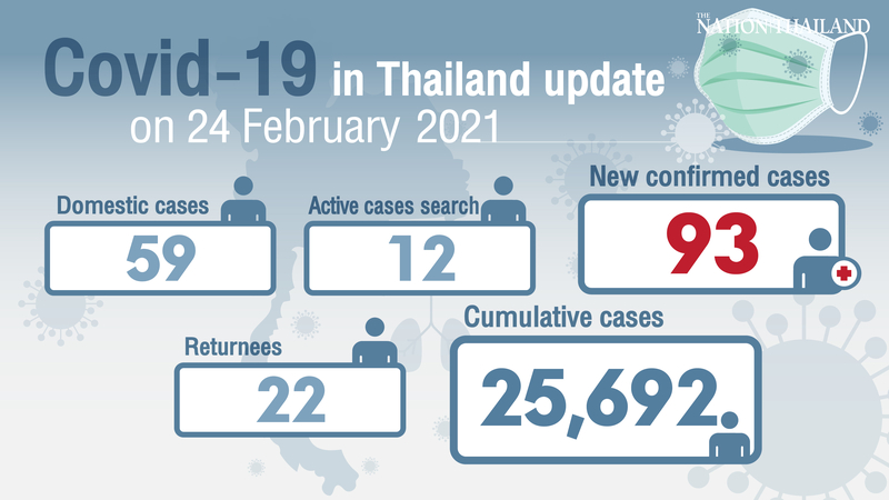 As of Wednesday, the number of confirmed cases in Thailand had risen to 25,692. Of these, 22,956 had been contracted locally, including 14,460 who were found via proactive testing, while 2,736 were returnees. So far, 24,542 have recovered and been discharged, 1,067 patients are still being treated and the death toll remains unchanged at 83.