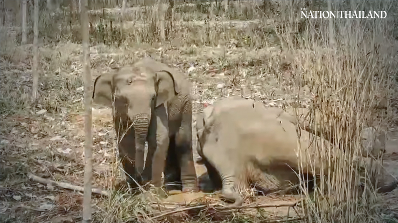 Veterinarians called to treat a sick wild female elephant in Chantaburi province on Sunday found their patient being guarded by a younger elephant, thought to be its offspring.