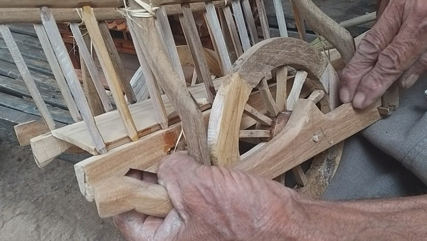 นายจอกแก้ว เล่าให้ “ทีมข่าวแนวหน้าออนไลน์” ฟังว่า ประดิษฐ์บ้านเรือนไทยและล้อเกวียนโบราณจำลองมาได้ 10 ปีแล้ว โดยเรียนรู้วิชามาจากครูที่หมู่บ้านทุ่งหลวง อ.คีรีมาศ และฝึกฝนฝีมืออยู่นานถึง 5 ปี กว่าจะเก่งชำนาญ ซึ่งเป็นการจำลองย่อส่วนจากของจริง แต่ละชิ้นจะใช้เวลาทำนาน 15 วัน ใน 1 เดือนก็ทำได้แค่ 2 ชิ้นเท่านั้น