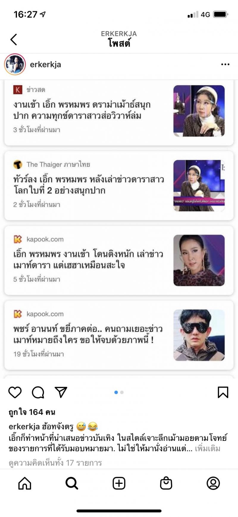 หลังโดนทัวร์ลงงานเข้า เอิ๊ก พรหมพร ดราม่าเม้าธ์สนุกปาก ความทุกข์ดาราสาวส่อวิวาห์ล่ม พีเอิ๊ก เลยขอออกมาชี้แจง ผ่านไอจีส่วนตัว @erkerkja