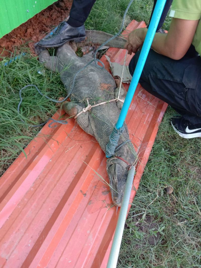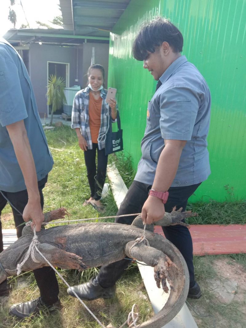 เมื่อถึงร้านเกิดเหตุพบเจ้าของร้านและลูกค้า ยืนรอเจ้าหน้าที่ ด้วยสีหน้าตกใจตื่น ก่อนแจ้งว่า มีตัวเหี้ยขนาดใหญ่เกือบเท่าจระเข้ ไม่ทราบว่ามาจากไหนวิ่งพรวดเข้ามาในร้านกลางวงขณะลูกค้านั่งกินขนมจีน ก่อนจะตกใจตื่นทั้งคนทั้งตัวเหี้ย วิ่งหนีกันคนละทิศคนละทาง ส่วนตัวเหี้ยวิ่งหนีลงใต้ถุนร้านขนมจีน จึงใช้บ่วงอุปกรณ์คล้องที่คอจับตัวเหี้ยได้สำเร็จ โดยใช้เวลาประมาณ 20 นาที วัดความยาวได้ 1 เมตรกว่า น้ำหนัก 25 กิโลกรัม ก่อนนำไปปล่อยป่าห่างไกลบ้านเรือน