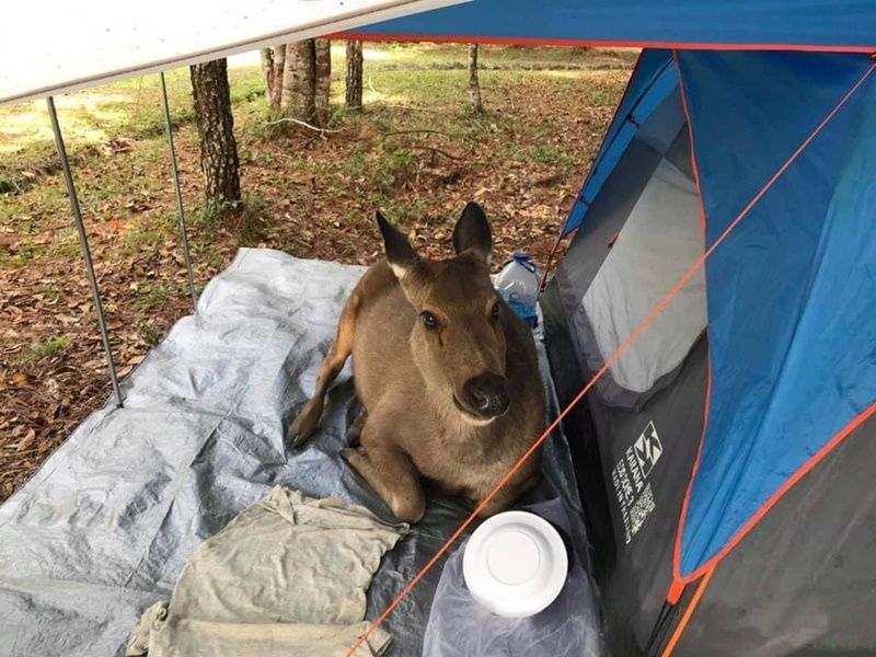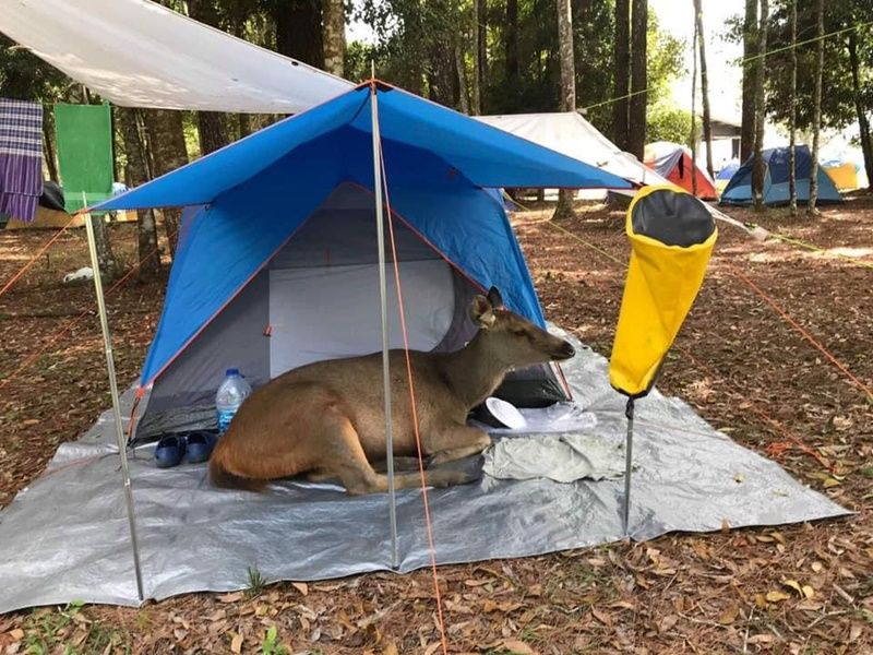 ขอบใจเพื่อนที่เฝ้าให้! กวางป่าเขาใหญ่นอนเฝ้าหน้าเต็นท์นักท่องเที่ยว