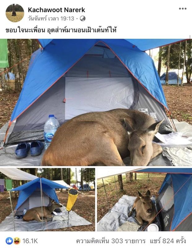 นี่เป็นภาพความน่ารักของกวางป่าเขาใหญ่ ที่มานอนเฝ้าอยู่หน้าเต็นท์นักท่องเที่ยว โดยภาพเหล่านี้ถูกโพสต์เมื่อวันที่ 1 มี.ค.64 เวลา 18.58 น. โดยเฟซบุ๊ก “เขาใหญ่ อุทยานแห่งชาติเขาใหญ่ Khaoyai National Park” ได้แชร์ภาพจากเฟซบุ๊ก “Kachawoot Narerk” โดยผู้โพสต์ระบุข้อความว่า “ขอบใจนะเพื่อน อุตส่าห์มานอนเฝ้าเต็นท์ให้” ทั้งนี้ หลังจากโพสต์ดังกล่าวได้เผยแพร่ออกไปได้มีชาวเน็ตเข้ามาแสดงความคิดเห็นและชื่นชมความน่ารักของเจ้ากวางป่าดังกล่าวและมีการแชร์ต่อกันออกไปอย่างกว้างขวางกว่า 1 พันครั้ง
