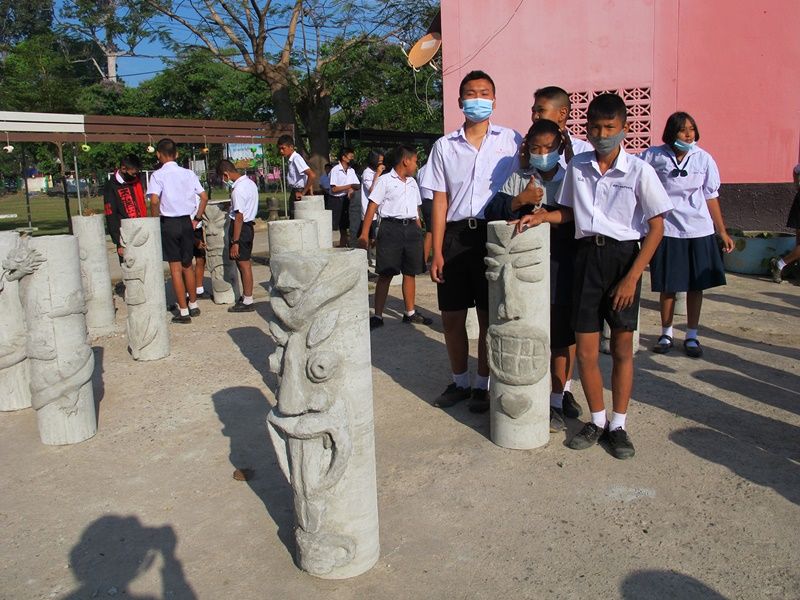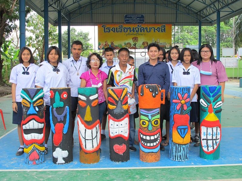 วันที่ 5 มี.ค.64 ดร.จักรพงศ์ มัตสยะวนิชกูล ผู้อำนวยการโรงเรียนวัดบางลี่ (วุฒิพันธุ์วิทยา) ต.โคกหม้อ อ.เมือง จ.ราชบุรี ได้นำนักเรียนชั้นมัธยมศึกษาปีที่ 2-3 มาเรียนวิชาศิลปะปั้นหุ่นแนวติ๊กกิ (TIKI) โดยใช้การประยุกต์นำท่อซีเมนต์ยาวประมาณ 1 เมตรนำปูนซีเมนต์ผสมทรายมาปั้นตามรูปทรงที่ได้ใช้ถ่านไฟหรือดินสอร่างเป็นรูปโครงสร้างตามจินตนาการ ปั้นลักษณะลวดลายนูนปูนปั้น แล้วจึงลงสีให้ดูสวยงามแปลกตา