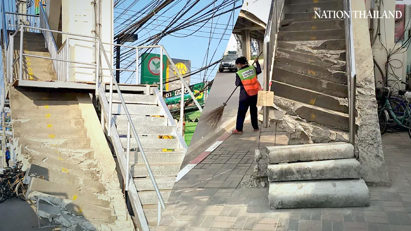 The bridge at Km 14+075 had been damaged since March 2 when an SUV reportedly smashed into the steps of the bridge, rendering the bridge unsafe for use and leaving pedestrians stranded on both sides of the eight-lane Rama II Road. The bridge is the only way for pedestrians to cross Rama II Road. The next bridge is about three kilometres away.