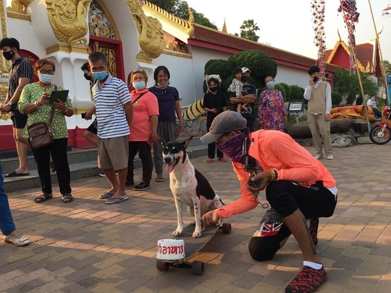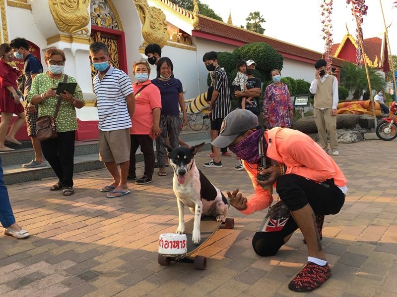 สุดทึ่ง!! เจ้าโควิดสุนัขแสนรู้ โชว์ลีลาเล่นสเก็ตบอร์ดผาดโผน เอาใจคนรักน้องหมาหน้าวัดพระธาตุพนม เจ้าของย้ำไม่ได้นำมาหารายได้ แค่สร้างความสุขให้คนมาทำบุญ