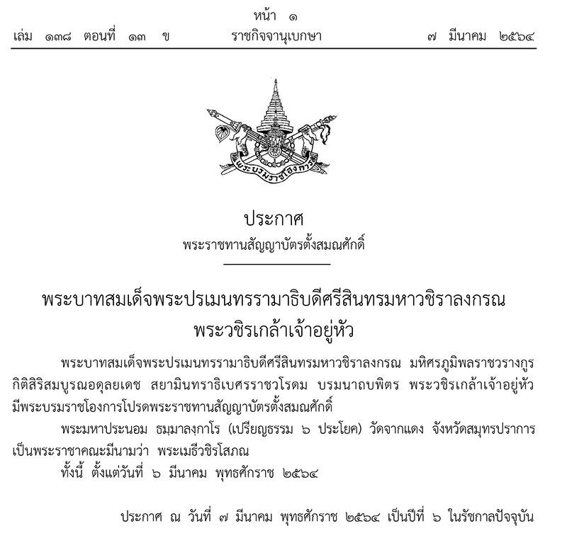 ประกาศ ณ วันที่ 7 มีนาคม พุทธศักราช 2564 เป็นปีที่ 6 ในรัชกาลปัจจุบัน