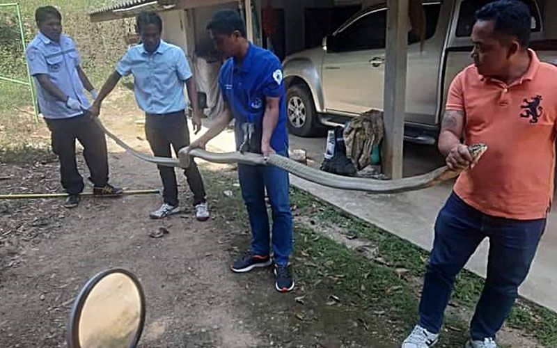 เมื่อเวลา 07.30 น.วันที่ 9 มี.ค.64 นายสุรชัย ใหม่นิ่ม เจ้าหน้าที่กู้ชีพเทศบาลตำบลทุ่งใส อ.สิชล จ.นครศรีธรรมราช ได้รับแจ้งขอความช่วยเหลือเหตุงูจงอางเข้าบ้าน เลขที่ 27/2 บ้านช่องเสียด หมู่ 6 ต.ควนทอง อ.ขนอม เขตรอยต่อ ต.ทุ่งใส อ.สิชล จึงเดินทางไปตรวจสอบที่เกิดเหตุพบนายปรีชา ฤธิรงณ์ อายุ 60 ปี เจ้าของบ้าน และคนในครอบครัว ยืนรอเจ้าหน้าที่อยู่หน้าบ้านด้วยสีหน้าตื่นกลัว ก่อนแจ้งว่าในห้องนอนหลังบ้าน มีงูจงอางขนาดใหญ่ ซุกอยู่ในกองผ้าใกล้ราวตาผ้า จึงเข้าไปตรวจสอบพบงูจงอางนอนขดตัวแน่นิ่งอยู่ จึงใช้บ่วงอุปกรณ์จับงูจงอางได้สำเร็จ โดยใช้เวลาประมาณ 20 นาที วัดความยาวได้ 5 เมตร จึงนำใส่กระสอบไปปล่อยป่าห่างไกลบ้านเรือน
